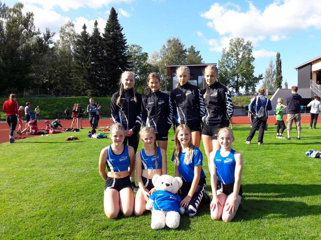 Vauhdin joukkueet T15- ja T11-sarjoissa (4x600m). Takarivissä Jonna, Ella, Jenni ja Maiju, eturivissä Venla, Julia, Henna ja Milja.
