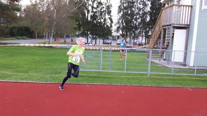 Naisten kympin kolmonen Pia Ahvenjärvi, Vehmaisten Urheilijat, kirii maalia kohti.