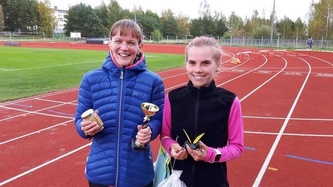 Naisten puolimaratonin kakkonen Outi Kokkonen ja voittaja Saara Kauranen lähtivät Mesihölkästä iloisina kotimatkalle palkinnon sylissään.