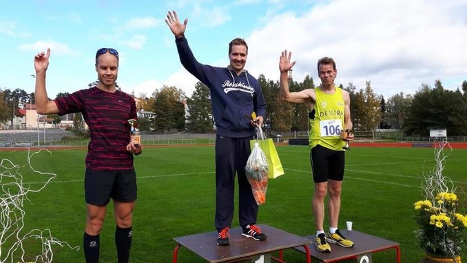Miesten puolimaratonin voittajat tuulettavat palkintopallilla, vasemmalta Olli Laine, Markus Välimäki ja Asko Nuikka.