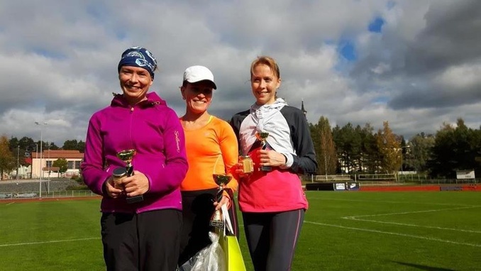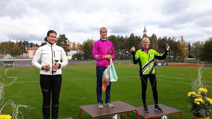 Naisten kympin kärkikolmikko palkintopallilla, vasemmalta Laura Kempas, Satu Mäkelä ja Pia Ahvenjärvi.