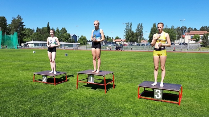 ![]() Naisten 800 metrin voittajat palkintopallilla, vasemmalla Ella Koskiniemi Espoon Tapiot, keskellä voittaja Siiri Rainio Jyväskylän Kenttäurheilijat ja oikealla Nora Kytäjä Lempäälän Kisa Yleisurheilu. |
