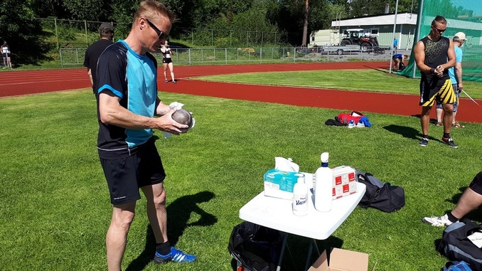 ![]() Koronaohjeiden mukaisesti kuulat desinfioitiin ennen jokaista työntöä. Toijalan Vauhdin Teemu Salminen valmistautuu kilpailusuoritukseensa puhdistamalla kuulan. |