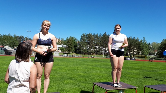 ![]() Naisten keihäänheiton voitti Viialan Valtin Neea Suhonen tuloksella 30,76. Kisan kakkonen oli Johanna Hakalahti Tampereen Pyrinnöstä tuloksella 26,74. Palkinnot jatkoi Vauhdin puheenjohtaja Heidi Hiden-Knuutila. |