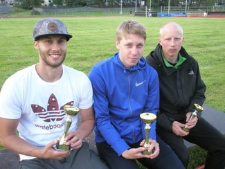 ![]() Miesten seiväshypyn kolme parasta saivat palkintonsa urakkansa päätteeksi: vasemmalla kisan kakkonen Jere Bergius Tampereen Pyrinnöstä, keskellä voittaja Aleksi Saarelainen Espoon Tapioista ja oikealla Olli Rannikko Nokian Urheilijoista. |