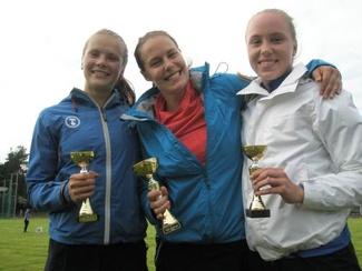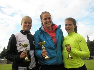 ![]() Naisten sadan metrin voittajakolmikko palkintopallilla: vasemmalta kisan kakkonen Nea Laine Hämeenlinnan Tarmosta, keskellä voittaja Noora Toivo Toijalan Vauhdista ja oikealla kisan kolmonen Amanda Lapinleimu Toijalan Vauhdista. |