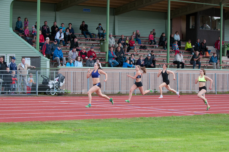 Naisten 200 metrin maaliintulo: kuvassa vasemmalta voittaja Noora Toivo Toijalan Vauhdista, kakkonen Nea Laine Hämeenlinnan Tarmosta, neljänneksi sijoittunut Milla Kelo Keski-Uudenmaan Yleisurheilijoista ja kisan kolmonen Amanda Lapinleimu Toijalan Vauhdista. Kuvat 1-13: Jarno Renko |