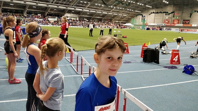 ![]() Milla (edessä) odottelee oman alkueränsä alkua 10-vuotiaiden tyttöjen 60 metrillä. |