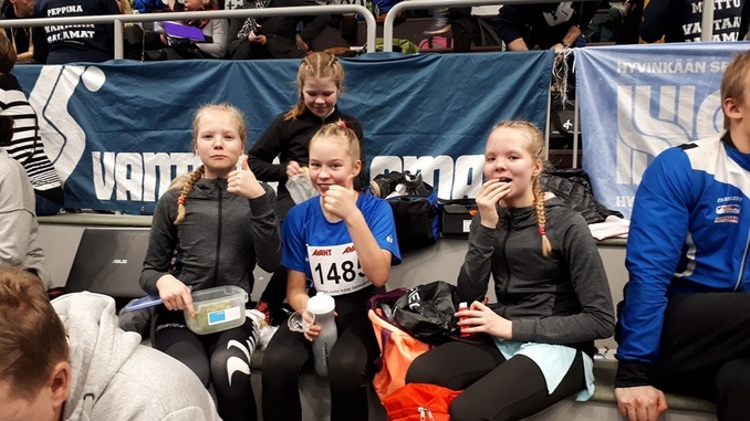 ![]() Huippuhyvät eväät ovat yksi kisamatkojen kohokohdista - sen puolesta peukuttavat Iina, Venla (takana), Wenica ja Seela |