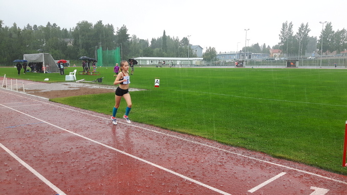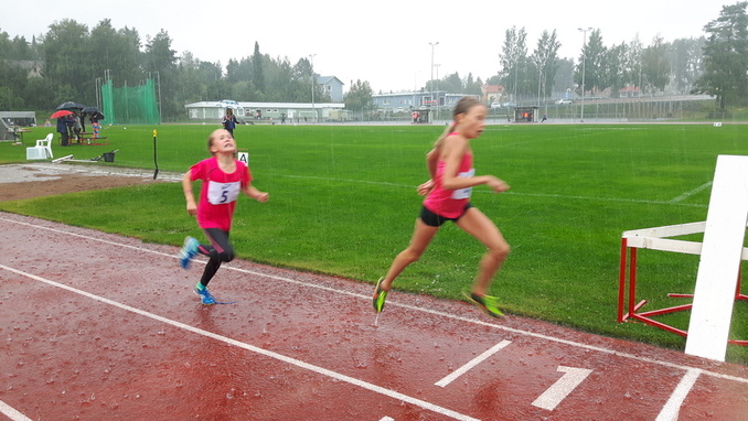 Viialan Valtin Elice Helenius (vas.) ja Helmi Hujanen (oik.) sekä Toijalan Vauhdin Tyyne Sihvonen vetävät henkeä 13-vuotiaiden tyttöjen 1000 metrin kilpailun jälkeen. Ravakassa vesisateessa juostu kisa ei saanut tyttöjen hymyä hyytymään.