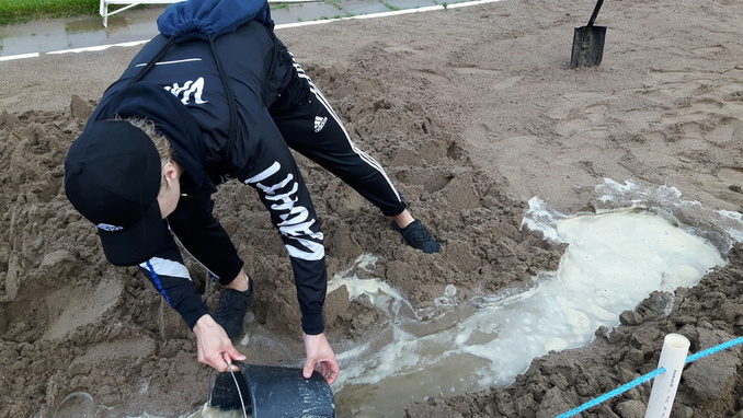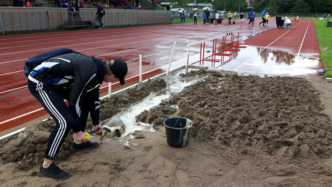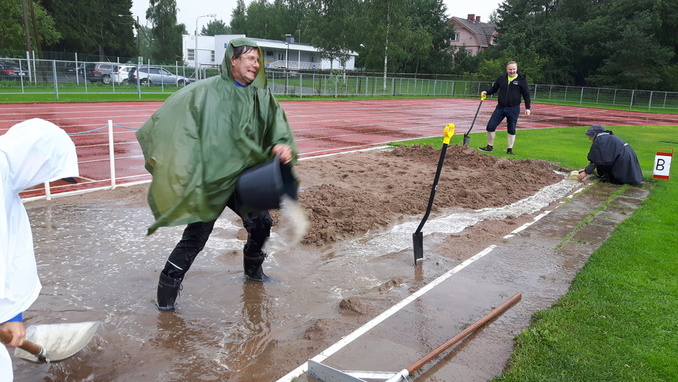 Toimitsijat kaivoivat veden vallassa oleviin pituushyppykasoihin ojia ja kauhoivat vettä pois ämpäritolkulla, ja näin vesi saatiin lopulta pois pituuspaikoilta.
