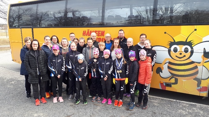 ![]() Retki Turun Kupittaalle tehtiin tilausbussilla. Ennen kotimatkalle lähtöä urheilijat, huoltajat ja harjoitusten ohjaajat kokoontuivat yhteispotrettiin. Hunajakaupunkia tehtiin tunnetuksi iloisen pörriäisen avulla. |