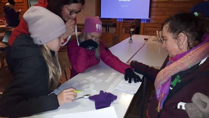 ![]() Illanvietto päättyi heijastin-kirjainyhdistelmien etsintään ja pieneen aivojumppaan oikean yhdyssanan löytämiseksi. Jotta heijastinten haku ei menisi liian helpoksi, joukkueen jäsenet sidottiin käsistään yhteen. |