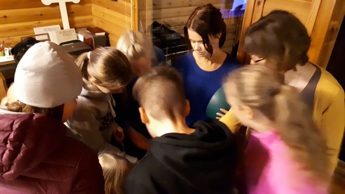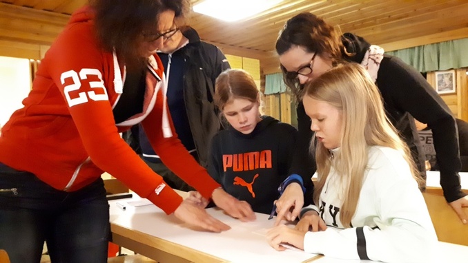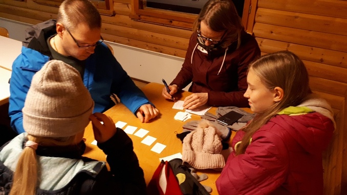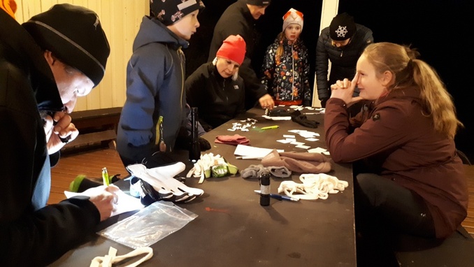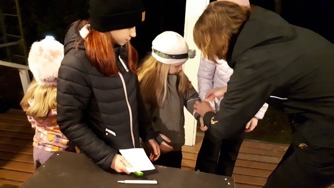 ![]() Illanvietto päättyi heijastin-kirjainyhdistelmien etsintään ja pieneen aivojumppaan oikean yhdyssanan löytämiseksi. Jotta heijastinten haku ei menisi liian helpoksi, joukkueen jäsenet sidottiin käsistään yhteen. |