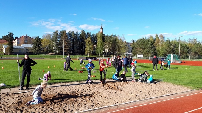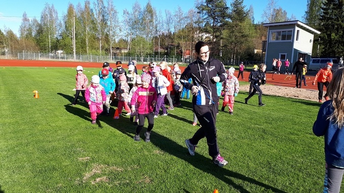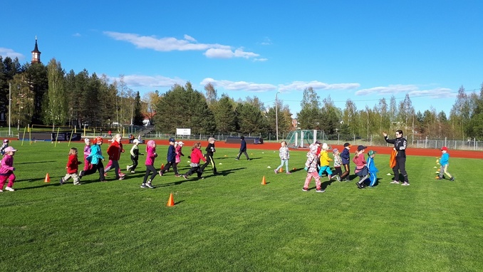 ![]() Lapsille oli infon aikana toimintaa kentällä - Tossujen ohjaaja Julia Talvitie vie lapsia letkassa pujotteluradalle. |