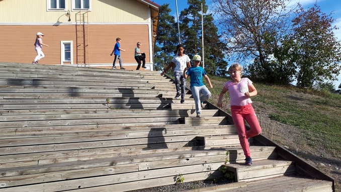 ![]() Koulun ympäristöä ja maastoa hyödynnettiin juoksemalla ja loikkimalla katsomossa ja portaissa. |