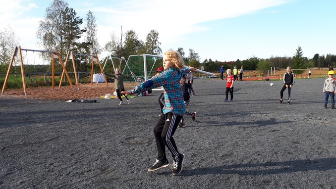 ![]() Keihäänheittoon ei välttämättä tarvita oikeita keihäitä. Voimapäivässä heitettiin innolla lehtikeihäitä, jotka paitsi lentävät hyvin, ovat myös turvallisia heittää. |
