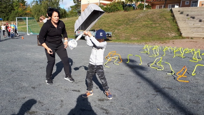 ![]() Hanna Honkamäki opastaa oppilasta, miten kassimoukari saadaan lähtemään korkealle ja kovaa. |