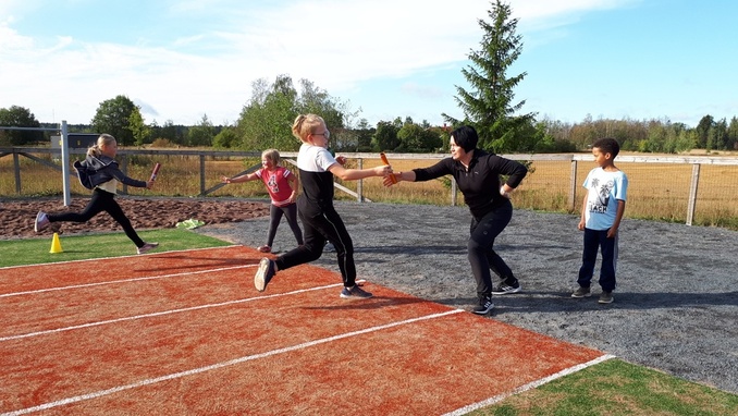 ![]() Uusilla juoksuradoilla järjestettiin myös pienimuotoisia sukkulaviestejä, joissa käytettiin oikeita viestikapuloita. Myös koulun johtaja Hanna Honkamäki kiidätti viestikapulaa joukkueessa. |